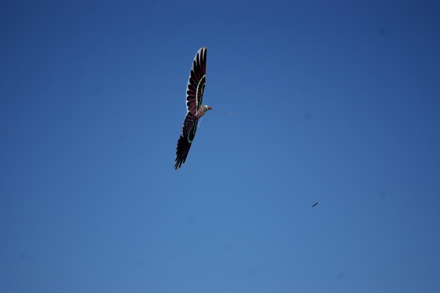 这种风筝不知社里是否有同学耍过?它牛就牛在能模仿老鹰的飞行姿态,时而俯冲时而盘旋,滑翔的非常稳。飞到高空的时候经常会被误以为是真的老鹰,这张照片是它直奔老独老师一个俯冲下来之后收起爪子向上飞的时候拍下来的。