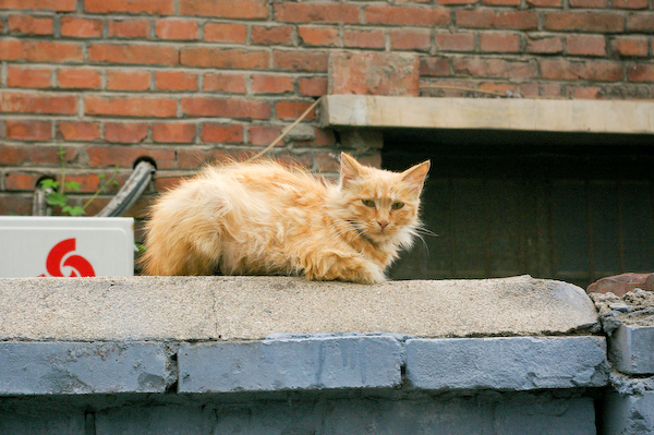 墙头的小猫比较瘦弱,我很抱歉为了好玩儿端着相机步步逼近,打扰了它的休息: